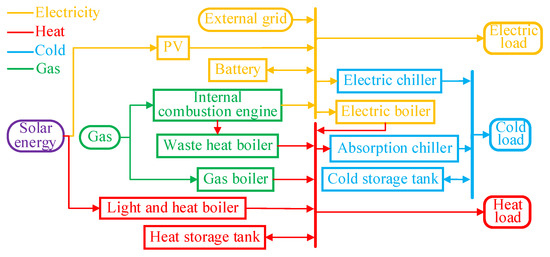 The load demand of the industrial park is mainly electric load, heat load, and cooling load; the energy supply mode of the park is mainly solar energy, external grid electricity, and pipeline natural gas. In terms of energy equipment selection and installation, the environmental conditions of the park can meet the needs of installing photovoltaic and solar thermal boilers with a certain capacity; central cooling and heating of the park can be realized by installing absorption refrigeration devices, electric refrigeration devices or electric heating devices; it is allowed to install a certain capacity of electricity storage, heat storage, and cold storage devices to improve the flexibility and reliability of the energy supply of the park’s integrated energy system. Therefore, the basic energy flow structure of the integrated energy system of the industrial park is shown in Figure 5.