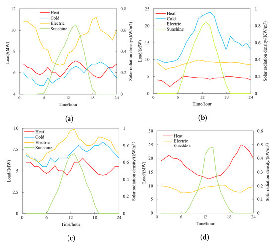 The load curve and solar radiation density curve of the park. (a) Typical day in spring. (b) Typical day in summer. (c) Typical day in autumn. (d) Typical day in winter.