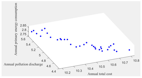 The Pareto frontier solution obtained by the improved multi-objective particle swarm algorithm is shown in Figure 7. It can be seen that the total annual cost of the park’s integrated energy system planning and the annual pollution emissions are mutually restricted. When the total annual cost of the program is lower, the pollution emissions are higher. This paper selects five planning schemes from the Pareto frontier solution in Figure 7 to form a set of optimal planning schemes. Table 7 and Table 8 list the system configuration and calculation values corresponding to these five schemes, respectively.