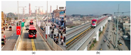 (a) Bus Rapid Transit System in Lahore; (b) Light Rail Transit System in Lahore.