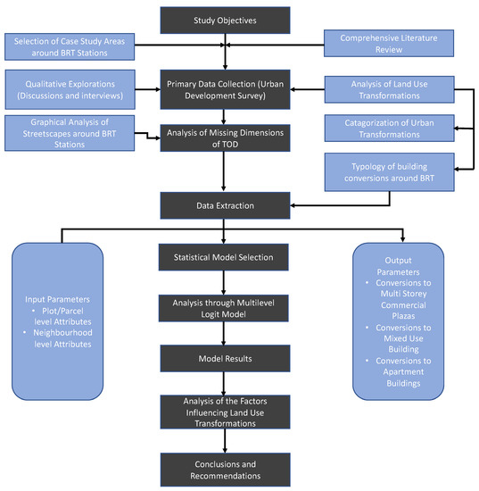 A complete comprehensive framework of this research is shown in Figure 4, through which one can easily understand the research structure. This research has not only used the large-scale urban planning approach, but it has concentrated on an intermediate scale to investigate vivacious phenomena of land use transformation, streetscape activity shifts, properties reconfiguration, densification, and land use revitalization around BRT transit stations. This research has used both quantitative and qualitative analysis techniques to detect changes in the urban fabric along BRT Lahore during last decade. Qualitative analysis has helped to analyze the missing dimensions of TOD, and quantitative analysis assisted in quantifying the changes and identifying factors that contributed to land transformations. To analyze the effects of the BRT system of Lahore on land development activities, a detail urban development survey was conducted in 2018 and validated in 2019/2020 to gather the parcel level data, and drone images of the case study areas were also taken (as shown in Figure 5). Since land use changes are always measured in nominal scale, numbers are used to analyze the impacts of BRT system of Lahore on land use transformations. In order to analyze the factors that contributed to land use transformations and densification patterns, numerous data sources were drawn up. Table 2 describes and lists the key variables that were collected as well as the data sources.