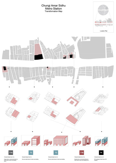 (a) Categories of urban transformation around Chungi Amarsidhu Station; (b) Typology of urban transformation around Chungi Amarsidhu Station.