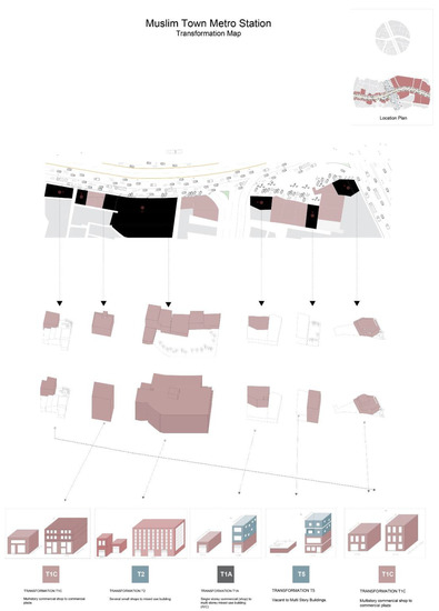 Overall, out of the total 4375 land parcels, 4126 land parcels remained unchanged, However, as the time goes on, many land use transformations are expected. Figure 15, Figure 16 and Figure 17 illustrates the typology of these transformations, and it can be observed that T1C and T3B are the most prominent transformations (which represent the intensification of commercial and residential uses). A big yellow parcel in the map shows T2 transformation where several small plots are amalgamated to build a multistorey commercial plaza. It is a famous landmark now in the catchment area of the metro station.