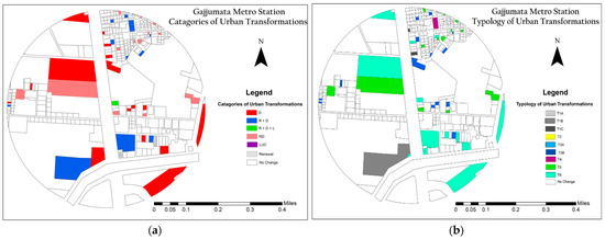 (a) Categories of urban transformation around Gajjumata Station; (b) Typology of urban transformation around Gajjumata station.