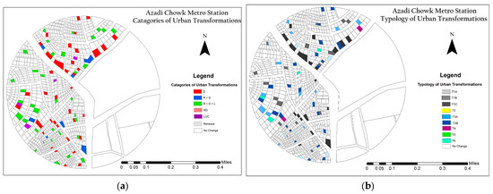 (a) Categories of urban transformation around Azadi Chowk station; (b) Typology of urban transformation around Azadi Chowk station.