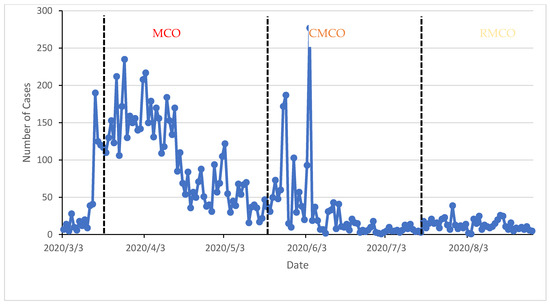 The number of cases surpassed 553 on 18 March 2020. The Malaysia Prime Minister announced the Movement Control Order (MCO). Only one person out of a single family could leave home to purchase the essential goods from their reference location [8]. Since 18 March 2020, the Malaysian government has restricted people from travelling to work and other countries’ states. As the number of positive cases remained high, the Prime Minister announced an extension of the MCO on 25 March 2020, for an additional 14 days [9]. As cases further increased, the Ministry of Health (MoH) Malaysia extended the MCO and by decreasing the cases, the MCO converted to Conditional Movement Control Order (CMCO) and Recover Movement Control Order (RMCO) which impacted the daily activity participation at different locations [10]. From 18 March 2020 to 27 August 2020, the first wave of COVID-19 in Malaysia was considered. The distribution of MCO, CMCO, and RMCO with the number of cases in the first wave of COVID-19 is shown in Figure 1. Moreover, the overall cases up to date are shown in Figure 2. Restricting participation in a different set of (research and physical) activities on a given day influences health parameters (physical, social, and mental) of Malaysians [11], especially international postgraduate students of different universities [12].