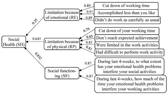 A measurement model and factor loadings of observed variables used to estimate social health.