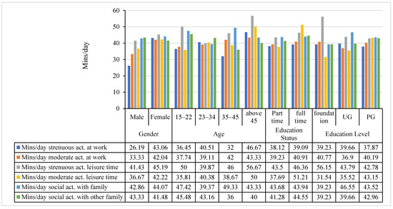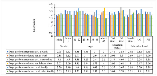 Figure 6 shows the frequency of strenuous and moderate-intensity physical activity at work, leisure time, and social activity with family and with other family members, with socio-demographic variables. Those aged 15–22 participate in more strenuous PA work and social activities, whereas those above 45 years participate in more moderate-intensity PA at leisure time. Compared to males, females are more involved in daily physical activity during the COVID-19 pandemic, which is opposite to the standard days. During the normal/standard days, males were involved in more daily out-of-home physical activities than females. However, during the COVID-19 pandemic, the individuals are forced to stay at home. Therefore, the work-from-home routine dramatically affects the males compared to the females. Moreover, those registered as full-time students show a high frequency compared to the part-time registered students. There is a slight variation in the foundation, undergraduate, and postgraduate students’ physical activity frequency at work and leisure time.