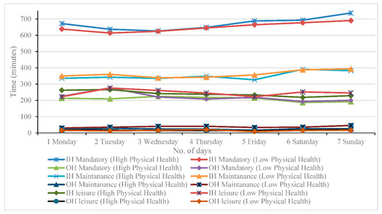 Figure 9 illustrates the relationship between daily time use and activity participation on social health. It was impossible to do social activities during the COVID-19 pandemic and having a 1-m gap between the individuals negatively influences an individual’s social health. The in-home maintenance activities become more than the out-of-home mandatory activities due to the restriction of going outside to the reference location and participating in out-of-home activities. However, the participation in out-of-home leisure and maintenance social activities almost reaches zero due to the COVID-19 pandemic which negatively affects the social health of individuals living in UTP, Perak Malaysia.