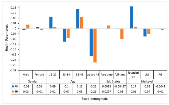 Figure 10 shows the effect of life stage variables such as socio-demographic variables on physical and social health. High physical and social health refers to someone with above zero (>0) physical and social health, whereas low physical and social health refers to those who have equal or less than zero (<0) physical and social health index. Those less than 15–22 years old show high physical and social health compared to those of 23–34 years old. This is because of participation in different physical and social activities. Those from the age of 35–45 years old have the highest physical and social health because of the family and work burden and participate in more physical and social activities, improving their physical and social health. However, those above 46 years old have the lowest physical and social health problems because of their workload, family burden, and weak body. As suggested by Rhodes et al. [37], age and gender are consistently related to physical activity. However, those above 50 years old have physical, social, and mental health problems.