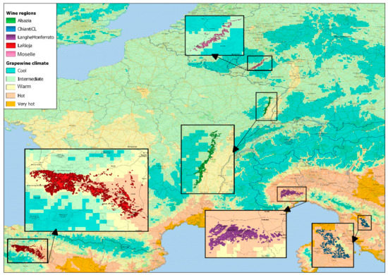 We have chosen five wine regions in Europe based on two criteria: the development of wine tourism [39] and the diversification of climatic characteristics (Figure 1).