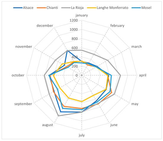 We downloaded data for a total of 34,758 photo points. The wine region with the highest number of photos is La Rioja (8840), followed by Alsace (7020), Chianti (6585), Mosel (6521), and Langhe Monferrato (5792). Figure 2 shows conspicuous seasonal trends in the presence of wine tourists in the five study areas. The tourist season is rather long from May to October with a peak of presence in the summer, more marked for Rioja and less for Chianti and Langhe Monferrato. Winter months have very low presences.