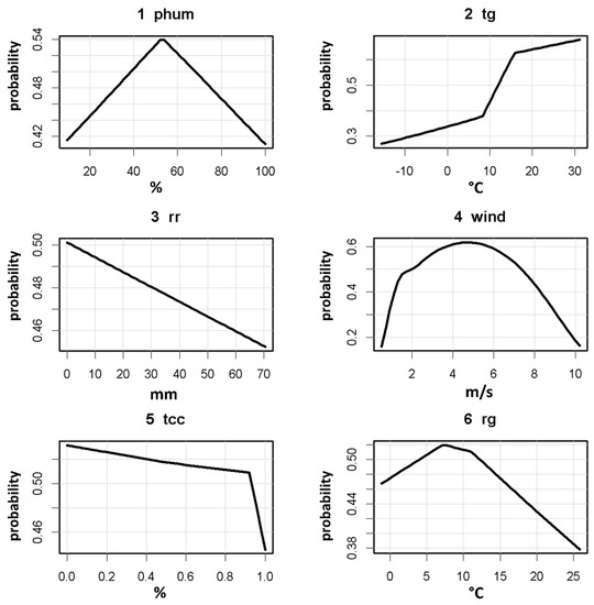 Finally, we applied the method of “univariate response curves” to the model [60]. Univariate response curves are commonly used to represent the complexity of the relationships between the dependent variable and a single independent variable of a nonlinear multivariate model. They are plotted by calculating the predicted probability of occurrence against the predictor of interest, while keeping all other predictors at their median values. We constructed the response curves using the R software plotmo library [61].