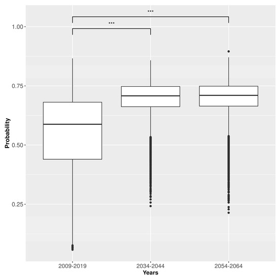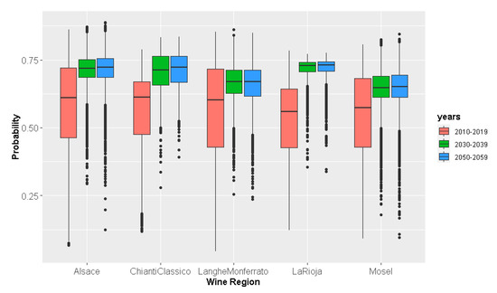 We performed the simulation of tourist presence in the 5 wine regions using Copernicus Climate model data for the 2030–2039 and 2050–2059 decades (Figure 6). The boxplots of the frequency distributions show that the probability of a tourist presence in the set of all 5 regions increases by applying the data from the future climate scenarios to the GAM model. In fact, the mean probability increases from the current 0.58 to about 0.68 in the future with very similar values in both decades. The probability frequency distribution narrows in the future: the 1st and 3rd quartiles are, respectively 0.43 and 0.68 in the past decade and about 0.63 and 0.74 in the two future decades, again with similar values for the latter ones. The difference between the mean probabilities is significant at p < 0.001.