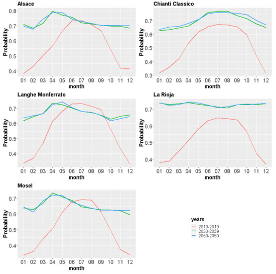 Figure 8 shows the monthly median values of the probability of having tourist visits in the five wine regions. Under current climatic conditions, all regions show a marked “summer peak” in the months of June, July and August for Alsace and Mosel and in the months of June to September for the other regions.