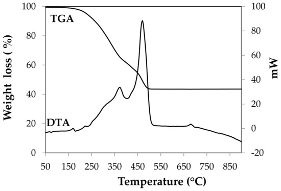 The spent oil bleaching earth (SOBE) residue was obtained from an olive oil produc-tion plant located in Vilches (Jaén, Spain). To dehydrate the residue received, it was dried in an oven at 105 °C. The sample had a moisture content of 6.66 wt%. It was then ground in a ball mill and sieved to a particle size of less than 100 µm. A thermogravimetric analysis (TGA)-thermodifferential analysis (DTA) of the dry residue was carried out to determine the temperature of the heat treatment to which the residue should be subjected. DTA-TGA was carried out on a Mettler Toledo thermal analyser model TGA/DSC 1. About 10 mg of the OBE sample (with a particle size of <1 mm) was placed in an aluminium crucible with an air flow of 50 mL/min and a heating rate of 10 °C/min from 30 °C to 900 °C. The TGA-DTA analysis (Figure 1) indicated that combustion of the residue takes place between 180 and 550 °C. The combustion of the oil takes place in two stages. The mass loss of the residue between 100–415 °C (39.05 wt%), exothermic peak centered at 375 °C and the weight loss between 415–550 °C (16.8 wt%), as indicated by the more intense exothermic peak centred at 473 °C. At 550 °C combustion of the residue ends. Therefore, the calcination temperature of the OBE residue was 550 °C for one hour in a Carbolite 1200 F kiln with a heating rate of 10 °C/min and a one-hour dwell time.