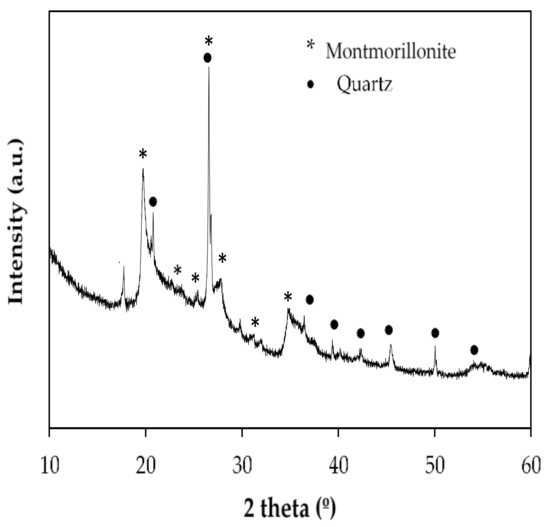 The mineralogy of calcined SOBE powdered sample was studied by X-ray Diffraction (XRD), using Empyrean X-ray powder diffraction equipment with a PIXcel-3D detector of PANalytical (Malvern, The Netherlands) (CuKα radiation, 0.15418 nm, 45 kV-40 mA, 2θ = 10–60°, step size 0.013° and measurement time: 15 min). HighScore software was used to identify the crystalline phases. Calcined SOBE residue has a mineralogical composition consisting of montmorillonite (82.4 wt%) (PDF: 96-900-5020) and α-quartz (17.6 wt%) (PDF: 96-900-5020). Baseline deviation between 18–30° (2θ) indicates an amorphous fraction in the residue (Figure 2).