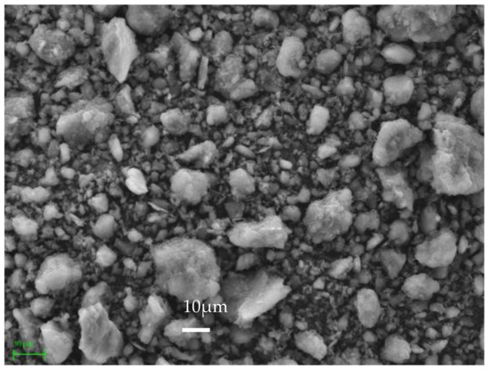 The morphology of the SOBE precursor calcined at 550 °C was determined by scanning electron microscopy (SEM), using a JEOL SM 840 model (Akishima, Tokyo, Japan) assisted by energy dispersive X-ray spectroscopy (EDS). Prior to observation, the samples were carbon-coated using JEOL JFC 1100 sputter coating. The micrograph is shown in Figure 3. A heterogeneous distribution of particles of different sizes and shapes can be observed.