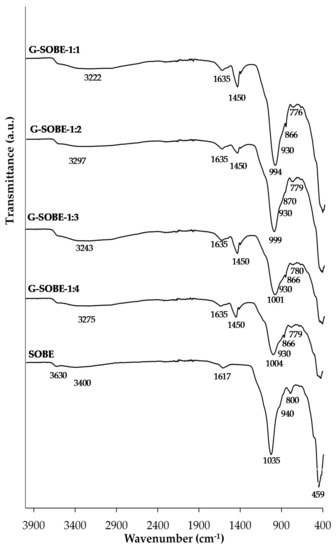 FTIR spectra of the raw material (SOBE) and geopolymers after 28 days curing are shown in Figure 4. A broad band centered at 1035 cm−1, corresponding to the Si-O-Si groups, is observed in the raw material, together with a weak shoulder centered at 940 cm−1, related to the vibration of the Al-OH bond of the bentonite [62]. The bands centered at 800 and 459 cm−1 are attributed to the stretching vibration of the Si-O bond [63,64]. Two bands are observed in the high-frequency region. A band centered at 3630 cm−1 associated with the Al-OH functional group [62] and the absorption bands located at 3400 cm−1 and 1617 cm−1, assigned to the stretching vibration and bending vibrations, respectively, are characteristic of the -OH groups of adsorbed water [65]. The geopolymers present similar patterns to the SOBE precursor, apart from the disappearance of the Al-OH functional group centered at 3630 cm−1 and of the Si-OH functional group centered at 459 cm−1. This may indicate that the montmorillonite layer reacts with the alkaline medium, giving rise to a geopolymeric gel [66] according to XRD data. The broad band between 1200 cm−1 and 900 cm−1 is associated with the asymmetric Si-O-Si vibration and the symmetric Al-O-Si bending vibration [67]. It can be observed that the Si-O-T (T:Si or Al) stretching vibration, centered on the precursor at 1035 cm−1, shifted to lower frequencies in the geopolymers (1004–994 cm−1). This change also indicates that the geopolymerization reaction has taken place due to the activation of the amorphous phase of the SOBE residue with the formation of N-A-S-H aluminosilicate gel, which means the condensation of Si-O tetrahedra as well as SiO4 and AlO4 in the geopolymer [40,68,69,70]. The band shift at lower frequencies may be due to an increase in the content of non-bridging oxygens, as well as to an increase in the amount of tetrahedral aluminum in the gel structure [27,71]. In all geopolymers, centered shoulders are also observed at 930 cm−1, which can be assigned to the formation of an Al-rich gel. Initially an aluminum-rich gel is formed, and with the progress of the reaction, when the aluminum is depleted the formation of a Si-rich gel begins [72]. The intensity of the band is also attributable to the amount of Si-O or Al-O in a tetrahedral configuration. The intensity decreases with a decreasing Na2SiO3/NaOH molar ratio of the activating solution [73]. Geopolymers synthesized using a Na2SiO3/NaOH = 1/1 mass ratio (Ms = 1.27) show a more intense band, suggesting greater disorder in the formed gel [68,74]. These results are consistent with the differences in compressive strength, discussed below. The bands centered at 3300–3200 cm−1 and 1635 cm−1 indicate the presence of water molecules adsorbed on the surface or trapped in the large cavities of the polymeric network [75]. The intensity of such bands enhances when the Na2SiO3/NaOH mass ratio increases, probably due to a higher dissolution of the SOBE precursor, leading to the formation of more hydrated compounds according to the reaction degree data. The absorption bands around 1450 cm−1 and 866–870 cm−1 are typical of the C-O bond stretching of the CO3 vibrational groups that are present in the inorganic carbonates found in all the spectra of geopolymer samples due to the formation of sodium carbonate [76].