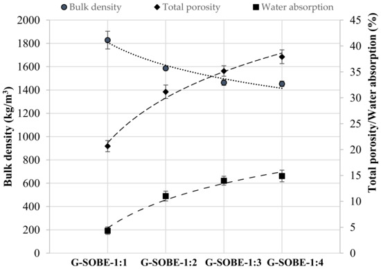 The values of bulk density, total porosity and water absorption of the geopolymers are shown in Figure 6. As expected, bulk density and total porosity or water absorption values followed an opposite tendency when the Na2SiO3/NaOH mass ratio of the activator changed. G-SOBE-1:1 specimens have a bulk density of 1828 kg/m3, total porosity of 20.7% and water absorption of 4.35%. As the Na2SiO3/NaOH mass ratio decreases, density decreases while total porosity and water absorption increases: G-SOBE-1:4 geopolymers show density = 1453 kg/m3, total porosity = 37.9% and water absorption = 14.9%. Samples prepared with lower Na2SiO3/NaOH mass ratios have more water (see Table 2). The water/binder ratio increases from 0.71 in G-SOBE-1:1 to 0.81 in G-SOBE-1:4 specimens; the removal of water will generate porosity [80]. Inadequate amounts of binder precursor and alkali solution results in less efficient dissolution of the precursor, with consequent creation of pores in the geopolymer matrix and the formation of a less homogeneous structure [81]. The ultimate removal of excess water upon drying will also create porosity. A decrease in the Si/Al molar ratio tends to generate less dense structures as a consequence of slower geopolymerization, according to the degree of reaction data [82]. So, we have physical and chemical/reactive contributions to the observed tendencies.