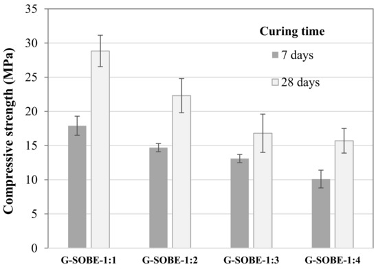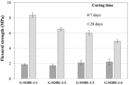 The flexural strength values of the samples are shown in Figure 9. Between distinct formulations the changes follow the same trend in mechanical resistance after 28 days curing. However, differences after 7 days are minor, and sample G-SOBE-1:4 shows the maximum value (2.2 MPa). Progress with curing age is now more expressive, and resistance after 28 curing days is three to four times higher than at 7 days. Interestingly, it was observed that flexural strength values are only about three times lower than corresponding compressive resistances in samples cured for 28 days.