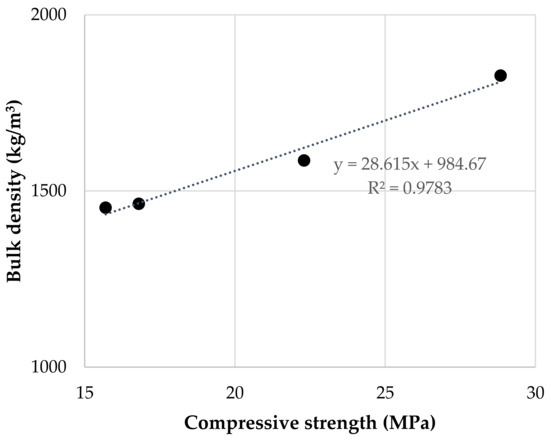 Relationship between bulk density and compressive strength of geopolymers cured for 28 days.