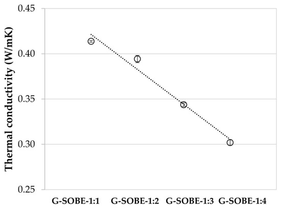 The geopolymers showed thermal conductivity values in the range 0.30–0.41 W/mK (Figure 10), being lower in samples less dense (the ones prepared with a lower Na2SiO3/NaOH mass ratio). As expected, there is an inverse relationship between thermal conductivity and porosity [88]. In general, geopolymers exhibit lower thermal conductivity values than Portland cement (1.5 W/mK) [89,90], due to the existence of pores in the microstructure [91,92].