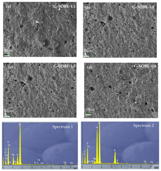 At higher magnification (2000×, Figure 12), sodium aluminosilicate gel with a spongy and globular morphology is visible in all samples. Its elemental chemical composition reveals the dominance of silicon, aluminum and sodium (zone 1 EDS analysis), as expected. In addition, unreacted SOBE particles with angular shapes are also visible. EDS analysis (zone 2) shows an abundance of silicon and aluminum, and smaller quantities of potassium, iron and magnesium. It can be observed that as the amount of sodium silicate decreases the geopolymers contain more unreacted SOBE particles and possess a higher porosity.