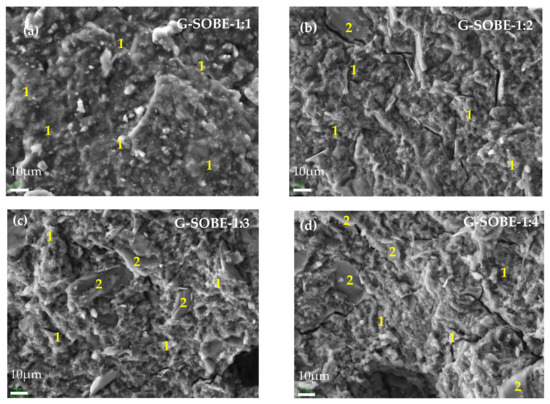 SEM/EDS micrographs (2000× magnification) of geopolymers cured for 28 days. (a) G-SOBE-1:1; (b) G-SOBE-1:2; (c) G-SOBE-1:3; and (d) G-SOBE-1:4.