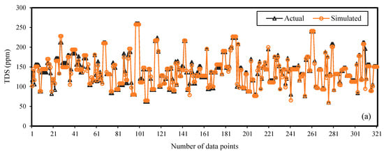Scattered plots of actual and simulated results for (a) TDS and (b) EC, using artificial neural network (ANN).