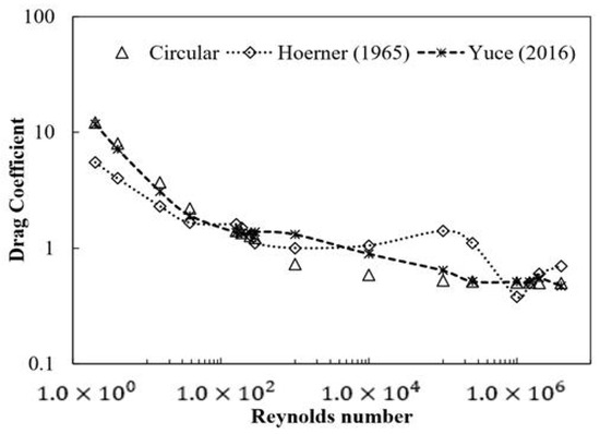 For a Reynolds number between 1 and 10, the simulation results seem to have slightly overpredicted the drag coefficient. As with the results in [24], the drag coefficient maintained approximately a constant value from 1 × 102 to 1 × 103. The drag coefficient that features a sharp drop in the Reynolds number exists between 1 × 105 and 1 × 106. This current model predicted a near-constant value in this range. The drag coefficient between 1 × 104 and 1 × 107 mirrors the trend found in [17].