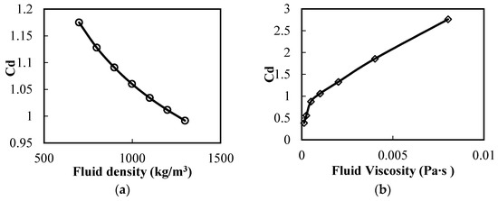 Figure 7 presents the results of the sensitivity analysis performed to study the effect of fluid density (water) and viscosity (water) on the drag coefficient. The fluid viscosity and density were sensitized because, during drilling, they can be modified depending on the drilling conditions. The sensitization also indicated the effect of the drag coefficient on the settling velocity of drill cuttings.