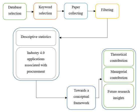 A Systematic Literature Review (SLR) approach is applied to this study for collecting, filtering, and analyzing the related papers. The SLR is carried out by (1) defining appropriate keywords for searching, (2) identifying relevant papers, and (3) analyzing the extracted papers. A large number of papers have worked on the topic of procurement and I4.0 technologies separately [16,17,18,19,20,21], however, 70 papers mainly concentrate on the contribution of both subjects simultaneously which are selected from Scholar, Scopus, and Web of Science databases. Selected papers are mainly from renowned publications such as Elsevier, Springer, Taylor and Francis, Emerald, etc. The seven steps structure in Figure 1 is developed for further elaboration [22]. Besides, the significance of developing a systematic literature review has been addressed by Paul et al. [23] and Paul and Criado [24]. One of the important goals of a systematic literature review is to identify key research gaps based on what constructs, theories, and methods are utilized in different settings and in what contexts studies have been carried out. Accordingly, authors of a classic review article provide directions for future research concerning new and novel ideas, theories, measures, methods, and novel research questions. A very well-crafted literature review article has the potential to serve as a platform for future research because such an article explicitly synthesizes current knowledge, identifies research gaps, and suggests exciting new directions for future research in a given field of research, regarding Methodology, Constructs/Variables, Theory, and Contexts.