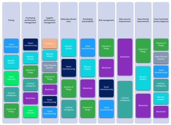 In this mapping process, based on the content analysis of the works analyzed in the SLR in the database and bounded keywords, we identified the most significant value that every procurement department may offer. Pricing, purchasing performance management, supplier performance management, reducing relevant costs, sustainability development, risk management, data security improvement, data-sharing improvement, cross-functional activity (logistics) are classified as primary values that the procurement department may offer, according to the literature. In each category mentioned, we identified related I4.0 applications, which can assist procurement managers in supporting the proposed values.