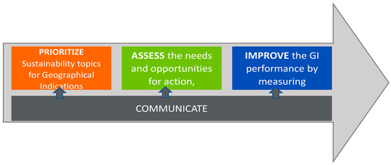 From this viewpoint, it is crucial to provide the appropriate tools for GI producers in order to permit them to become aware of the issues related to sustainability and to agree on priorities (Prioritize), from where they can assess the current situation (Assess) and define their action plan to address the issues and increase their sustainability performance (Improve). Throughout this path, communication is crucial for both internal management and externally for public information. A major difficulty for this process is the ability to approach the sustainability of GIs in a comprehensive manner, as the literature on GIs is usually focused only on certain elements of sustainability. Although some research has begun to consider a comprehensive approach to the assessment of the sustainability of GIs, in particular the Strenght2Food project (S2F) [29], not many sources provide a holistic view.
