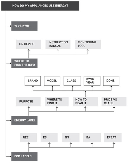 The next stage comprised the organization of the information platform content. The goal was to gather the content to fill in each question listed in the Table 1 to support information needs verified in Phase 1. The strategy used to create the questions was splitting these into smaller and simpler categories or sections, in order to create a step-by-step learning experience. Especially for the case of technical related concepts, a gradual exposure to such elements seemed the most adequate strategy—in order to reach different user starting-knowledge levels—where users could easily navigate, without feeling overwhelmed, and select the depth of information as desired or needed. An example of the information architecture used in the consumer section can be seen in Figure 1.