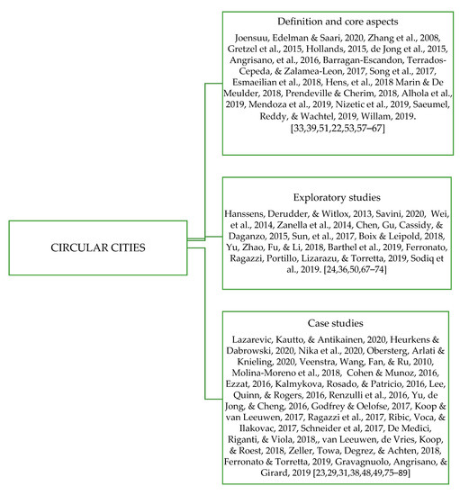 The reviewed studies on circular economy and circular cities. References in Definition and core aspects: [22,33,39,51,53,57,58,59,60,61,62,63,64,65,66,67]; References in Exploratory studies: [24,36,50,67,68,69,70,71,72,73,74]; References in Case studies: [23,29,31,38,48,49,75,76,77,78,79,80,81,82,83,84,85,86,87,88,89].