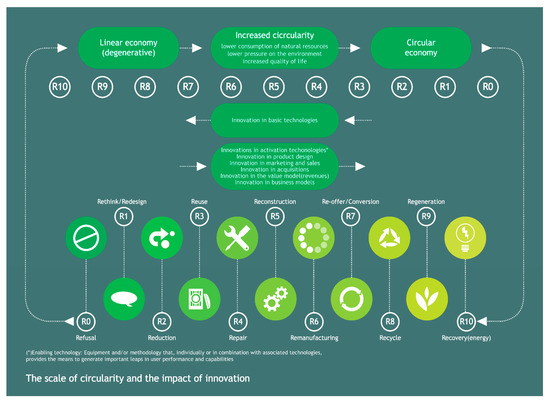 Our proposed framework to address this issue is illustrated in Figure 3. As it was stated in the results section, circular cities require innovative systems of production and consumption in order to attenuate the crisis of increasingly scarce non-renewable resources [38]. Circular cities also need innovation for resolving the challenge of creating efficient management systems of energy and materials [22]. Therefore, whether we are talking about energy systems, resource management, municipal waste or circular urban design, innovation remains an essential factor that conditions the improvement of all these pillars. For these reasons, Figure 3 proposes a model that explains how innovation contributes to the implementation of the circular economy in cities. As cities hold a variety of technological and human resources in such a condensed space, they have the potential to become a cradle of innovation for an urban circular economy that is based on the 10 Rs of the circular economy (Refusal, Rethink/Redesign, Reduction, Reuse, Repair, Reconstruction, Remanufacturing, Re-offer, Recycle, Regeneration and Recovery).