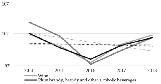 The prices of alcoholic beverages, broken down by categories, had also a downward trend in the period 2014–2018. From 2014, the prices of alcoholic beverages started to slow down their growth rates, so that in 2016 they all registered a decrease. The growth rate resumed in 2017 and continued with a slightly increasing trend in 2018. The decrease in the price of alcoholic beverages in 2016, for the three categories of beverages analyzed, can also be explained by the fact that in the same year there was a significant reduction of excise tax for all these types of alcoholic beverages (see Figure 3).