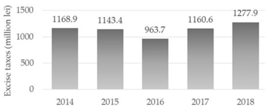 Excise taxes collected to the budget from the sale of alcohol, ethyl, intermediate products, sparkling wines, fermented beverages and beer, Romania, 2014–2018. Source: processed by the authors after data on taxation provided by the European Commission [53].