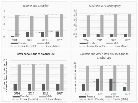 The deaths determined by the consumption of alcohol in Romania have varied differently depending on gender (see trend lines from Figure 6).