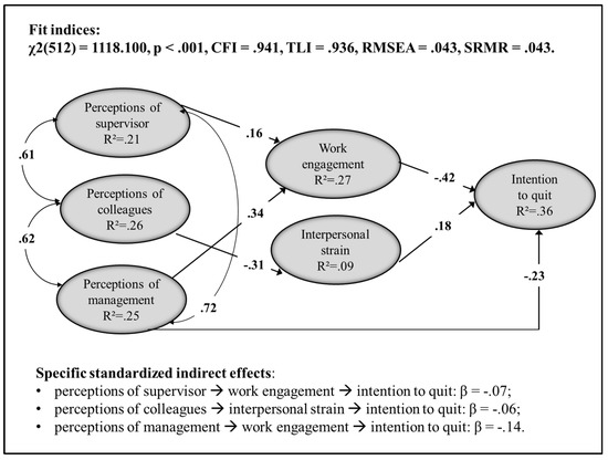 The PoSC of top management, immediate supervisors, and colleagues were included in the model as latent factors, measured by their items (five for supervisors and six for both colleagues and management). Work engagement, interpersonal strain, and intention to quit were also included as latent factors, loaded by seven, six, and two items, respectively.