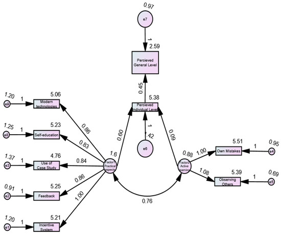 Most of the relations presented in a model were statistically significant. The impact of Factor 1, Practical Aspects, for the assessment of perceived determinants of employability that are connected with organizational learning at the individual level (Perceived Individual Level) was equal to 0.596, p < 0.001. On the other hand, the impact of Factor 2, Active Learning, was equal to 0.089, but with p = 0.477, it was not statistically significant. There was a strong positive correlation between both factors, equal to r = 0.76, p < 0.001. The presented model was tested for accuracy. As the result of the analysis, the following indicators were presented: CMIN/DF = 2.153; CFI = 0.973; RMSEA = 0.057; and PCLOSE = 0.261. All the above values prove the model to be accurate and well fitted.