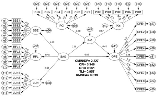 The structural model shown in Figure 2 was used to show the extent of the goodness-of-fit indices. The ratio of chi-square to degrees of freedom was 2.227, which is less than the upper permissible threshold of 3 [69]. The values of GFI, CFI, and TLI were greater than the lowest acceptable value of 0.90 [82]; the value of RMSEA was 0.039, which is less than the highest permissible threshold of 0.08 [83]. Thus, it can be considered the structural model used to test research hypotheses had good indexes to generalize the results.