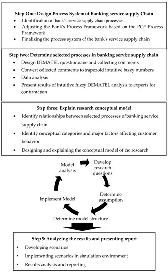 The model is based on configuring selected processes of the banking service supply chain. The banking service supply chain processes were identified and extracted by using the comprehensiveness feature of the process classification model as well as expert opinions, and the selected processes were identified using a multi-criteria decision-making approach, which was based on inter-process relationships and interactions. In order to confirm the service supply chain model presented by [8,61], which emphasizes the existence of the network and communication structure in the service supply chain, the relationships and interactions of the processes of product delivery, risk management, IT management, public relations and advertising management, and marketing and sales management as the selected processes of the banking service supply chain were explained by comments of the panel members, and in this way, the structural and communication dimension of the bank’s service supply chain was estimated. Since the customer’s pivotal role as the main characteristic of service was not confirmed in any of the presented models, a set of behavioral rules using the experimental design method was designed for customers and included in the model for further emphasis on the role of the customer in banking service supply chain management. The investigation into the service supply chain models showed that the dynamic nature of services and the flow of existing processes in the service supply chain were not considered. Therefore, the present study implemented a research model using agent-based modeling and simulation to encompass the complexity of the banking service supply chain.