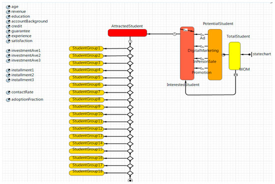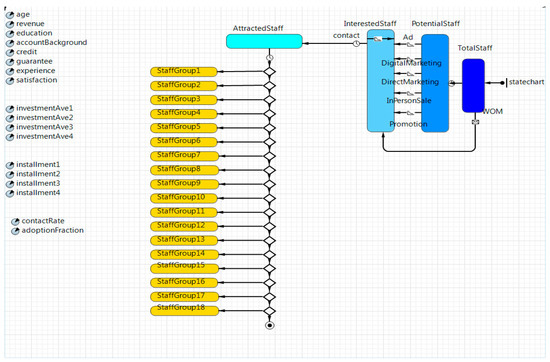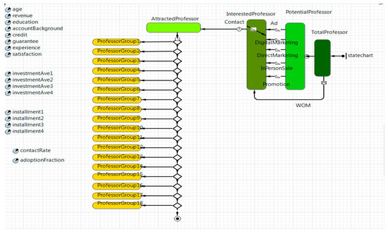 The present study implemented the conceptual model of the research in AnyLogic 8.8.2. To this purpose, it considered Tejarat Bank as the modeling environment and divided the bank’s customers as the model agents into three groups: students, professors, and employees. Since agent-based modeling factors interact with the environment and other factors, it was necessary to specify how each factor behaves in each population. Hence, the behavioral hierarchy is a state diagram for each population. Each factor population participating in the model is affected by a set of promotion tools in the IMC program with a given effectiveness rate within a defined time period, and after absorbing the effect of the promotion tools each factor can convert to a potential agent for deposits and receiving banking facilities. Figure 4, Figure 5 and Figure 6 display the state diagrams for the factor population of students, employees, and professors.