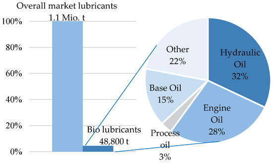 - Fachagentur Nachwachsende Rohstoffe e. V. (FNR): FNR: Mediathek—Gesamtmenge von Eingesetzten Pflanzenölen und Fetten im Schmierstoffmarkt in Deutschland 2016. Available online: https://mediathek.fnr.de/grafiken/daten-und-fakten/biobasierte-produkte/oleochemie/gesamtmenge-von-eingesetzten-pflanzenolen-und-fetten-im-schmierstoffmarkt-in-deutschland.html (accessed on 7 March 2019).