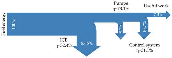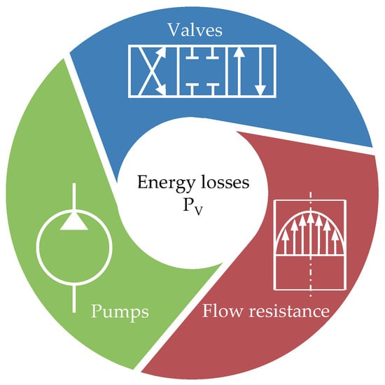 According to [14], the power loss results from the drive power and the efficiency of the hydraulic system (Equation (1)):