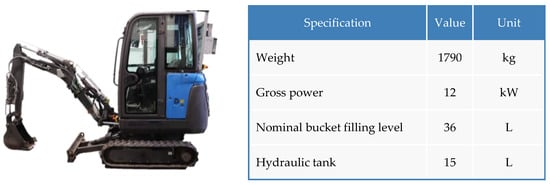 In Figure 4, the specifications of the test excavator are shown. The crawler excavator belongs to the class of compact excavators. It is driven by tracks. In addition to linear actuators, which are required for digging, the excavator has actuators for additional operations which are not regarded in the investigations. The test excavator is equipped with hydraulic-mechanical one-circuit load-sensing system, which is controlled by electro-hydraulic pilot valves instead of the usually implemented hydraulic joysticks. The load-sensing system is a hydraulic control system in which pressure or volume flow of the hydraulic pump are adjusted to the conditions required from the consumer. This system is widely adopted in hydraulic systems of mobile working machines.