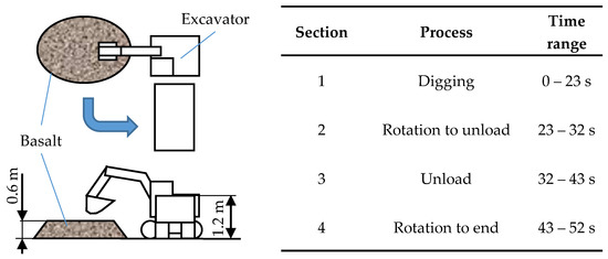 The typical construction site activity of an excavator consists of the sum of four different load cycles. These include “grading” with a ratio of 10%, “driving” with 20%, “idling” with 30% and a load cycle “digging” with 40% of the total task [19]. The executed test cycle is based on test cycles defined by Japan Construction Mechanization Association (JCMA) [20] for determining the fuel consumption and energy losses of hydraulic excavators, for example. A 90 degree dig and dump cycle is performed as a test cycle. Dimensions and execution of the cycle are shown in Figure 5. With nominal filling quantity of 36 L and moved basalt chips (8 to 16 mm grain size), the weight per transshipment is about 54 kg. After unloading the bucket, the upper carriage is swung back and the excavator arm is lowered into the starting position. The excavator position remains unchanged during the entire process. Tests are carried out in an air-conditioned laboratory so that the comparability of measurement results is ensured. In addition, the ambient temperature is recorded.